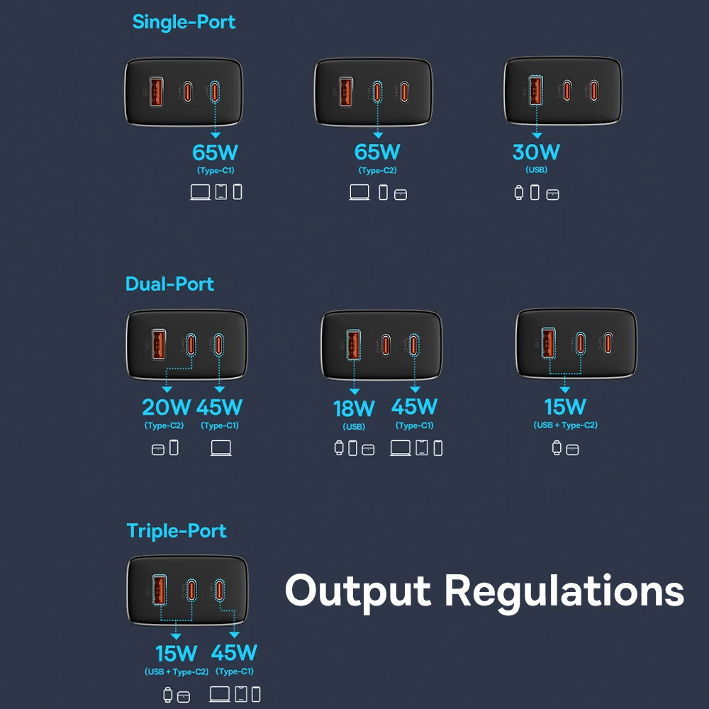 Type-C 1 + Type-C 2 Output: 45W+20W(65W)